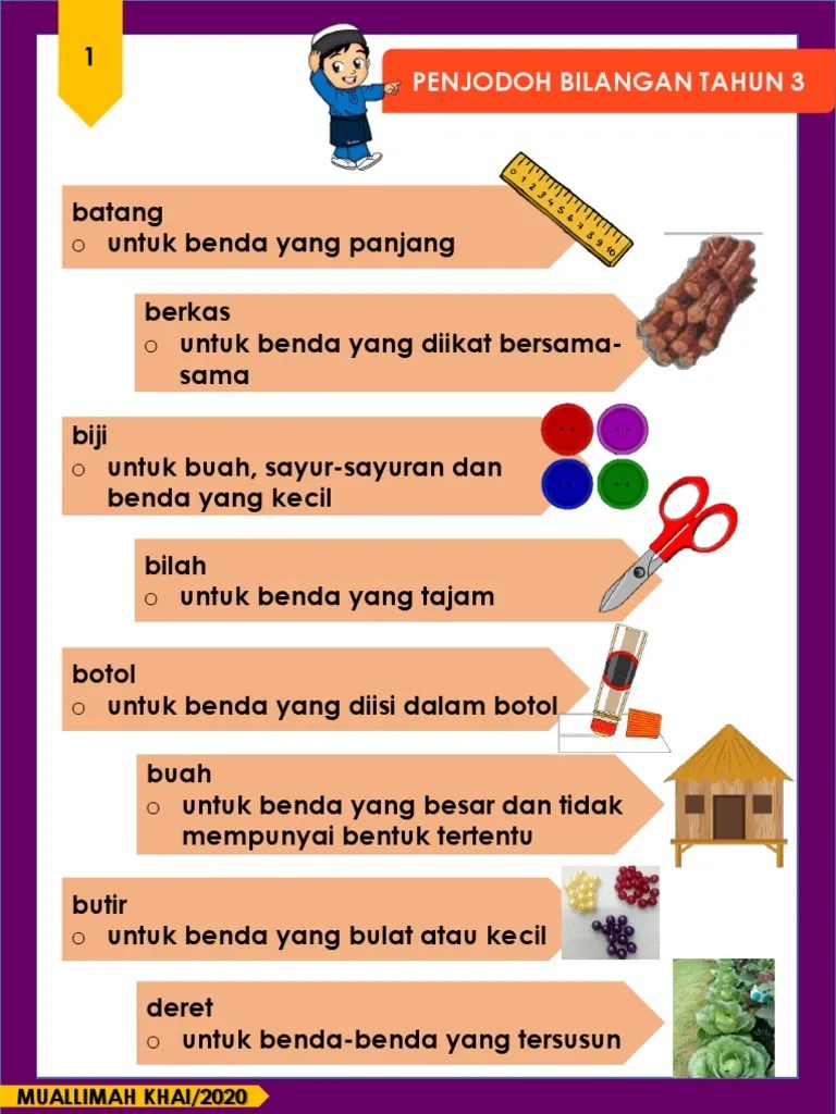 Benda yang panjang dan berangkai seperti rantai, tali, dawai, jam tangan dan sebagainya. Baris, kumpulan benda dalam bentuk garis lurus, sebaris ayat ; Penjodoh bilangan utk benda yg . Penjodoh bilangan 31 a urat b utas c untai d rawan 6 mereka duduk. Untuk benda yang panjang dan dapat digulung seperti rantai, dawai, tali, dan sebagainya. Angkatan, kumpulan seragam, seangkatan tentera ; Contoh ayat di bawah dipetik daripada kamus penjodoh bilangan untuk kbsr oleh. Tip contoh kesalahan dalam penggunaan penjodoh bilangan: Kapal perang, penulis, pelukis, tentera, sasterawan. Tali utk merangkaikan (manik, buah tasbih, dll), tali perangkai; Penjodoh bilangan 7 penjodoh bilangan kegunaan contoh das untuk bunyi letupan. Utas penjodoh bilangan yang digunakan bagi rantai (termasuk jam tangan . · · contoh ayat : emak membeli seutas rantai emas. Batang, benda panjang atau tinggi, sebatang sungai . Penjodoh bilangan · contoh ayat: